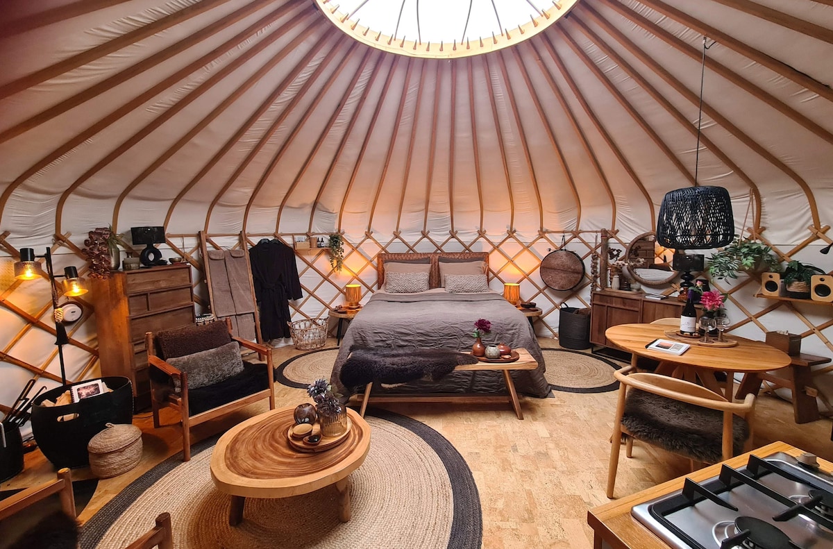 Yurt Venus is a magical place where you feel nature and embrace life around you. Enjoy the sun, moon and stars, the smell of rain and the rustling of the wind. Inside it is warm and cozy, outside the landscape stretches endlessly. No hustle and bustle, only peace, space and each other. A stylish retreat, with comfort and a touch of luxury and a large terrace outside. The ultimate glamping experience, in summer and winter, for a romantic stay for two.