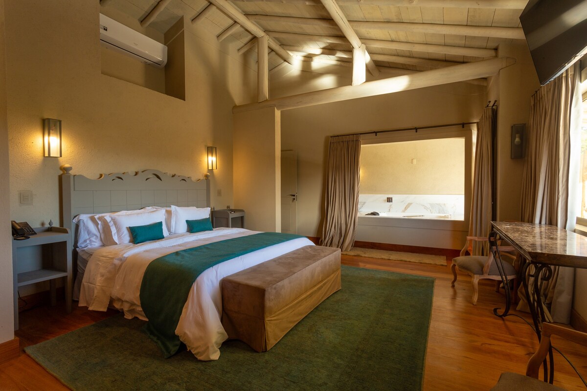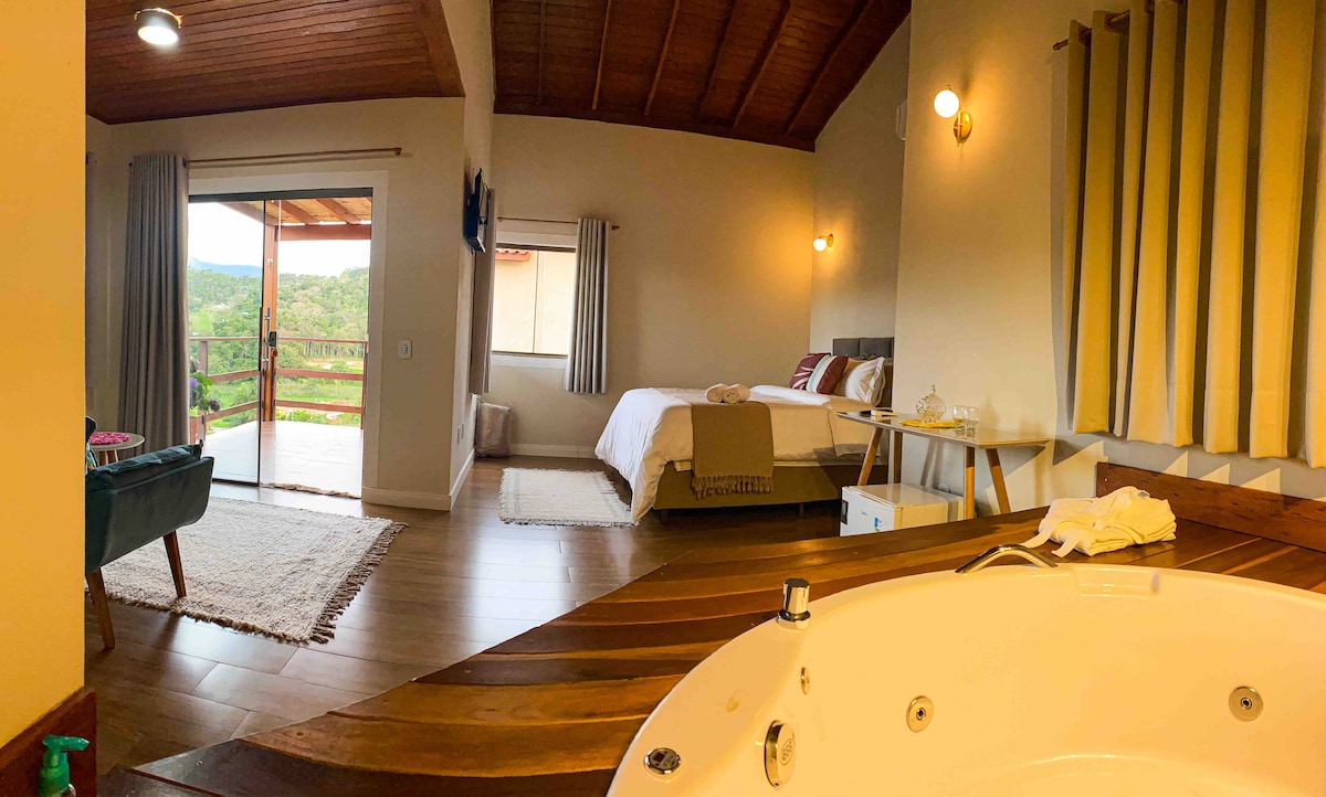 Nossa hospedagem oferece banheira de hidromassagem, cama queen, ar condicionado, frigobar, smart TV, Netflix, Wi-Fi.