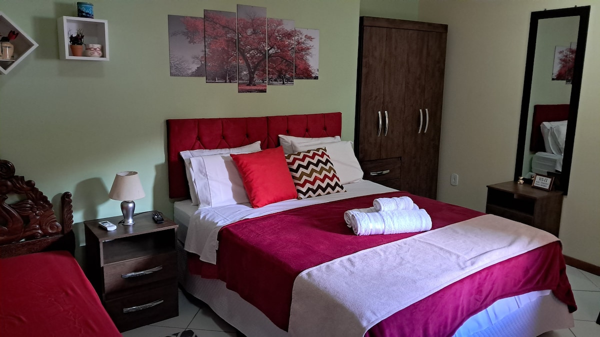 Suíte com varanda, cama de casal, cama de solteiro (favor solicitar) ar condicionado, Tv a cabo, Wi-fi, frigobar, cofre, dentre outras comodidades. Disponibilizo roupas de cama e toalhas para todos os hóspedes. (enxoval completo) Obs: tomadas 220v É OBRIGATÓRIA A APRESENTAÇÃO DA DOCUMENTAÇÃO DE CRIANÇAS NO CHECK IN ***********