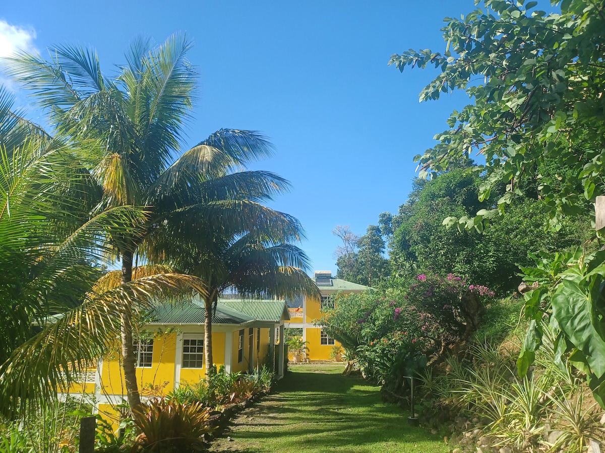 An atypical & lovely place for nature lovers and hikers surrounded by valleys & lush vegetation. All located in a magnificent & peaceful setting. The house was designed only with eco materials such as wood, driftwood & stones. To preserve the environment we use solar energy & rainwater. We offer: 4 bedrooms, 2 living rooms, 1 kitchen , terrace, dry toilet and outside shower. 15 mn hike from the village & 30 mn from Roseau. Rabbits are part of the place. Ideal spot to disconnect