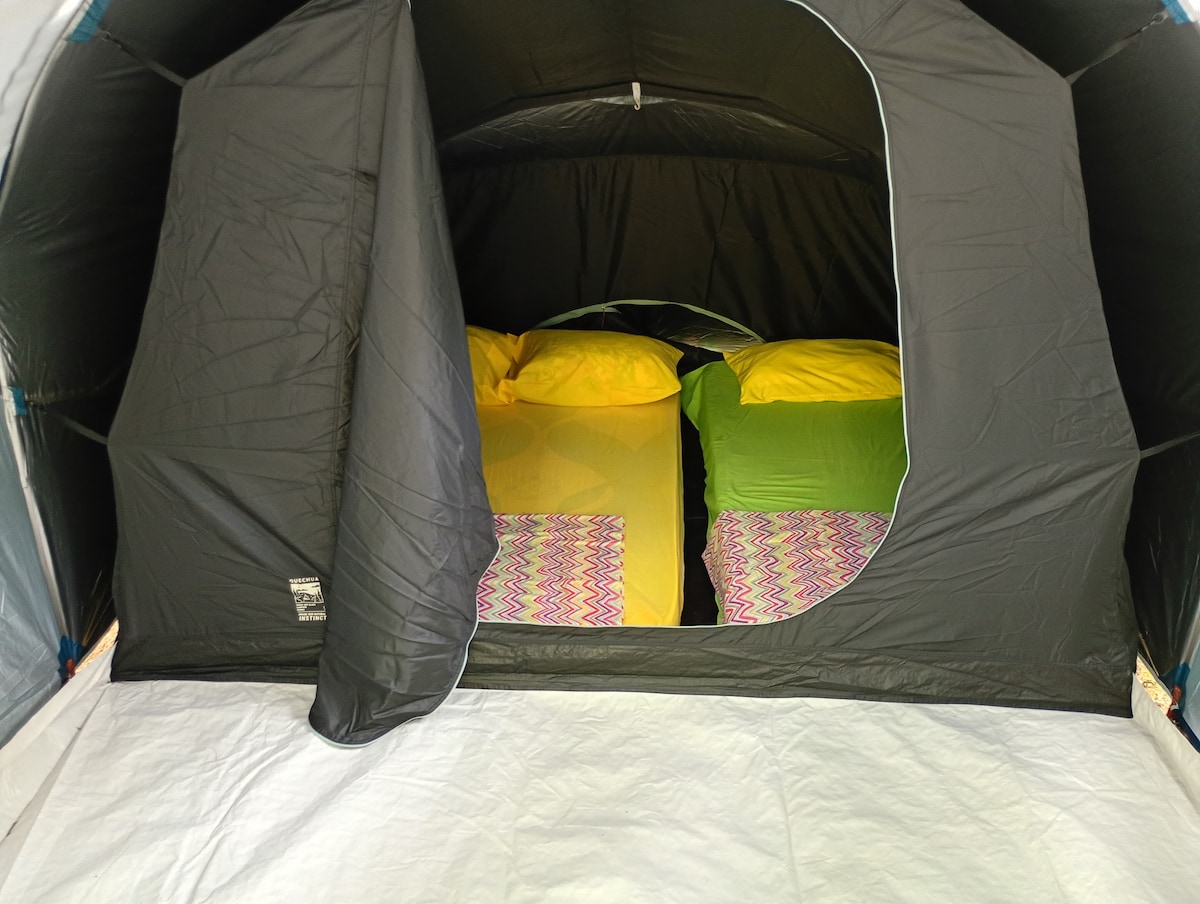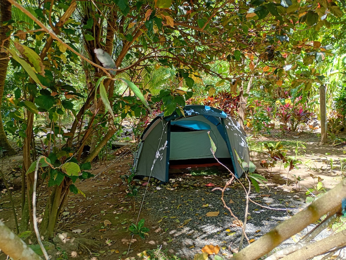 Deux tentes vous attend : une pour dormir avec un vrais matelas queen-size, une autre avec un salon et des espaces de rangement. Et entre les deux, votre coin repas privé. Niché sous les cacaotiers, à seulement 20m de la piscine pour des plongeons rafraîchissants. Douche en plein air et cuisine au bord de la piscine avec barbecue inclus ! Il y a un ventilateur à batterie, un générateur solaire pour brancher vos appareils, des lampes solaires et le WIFI. C'est du camping tout confort!