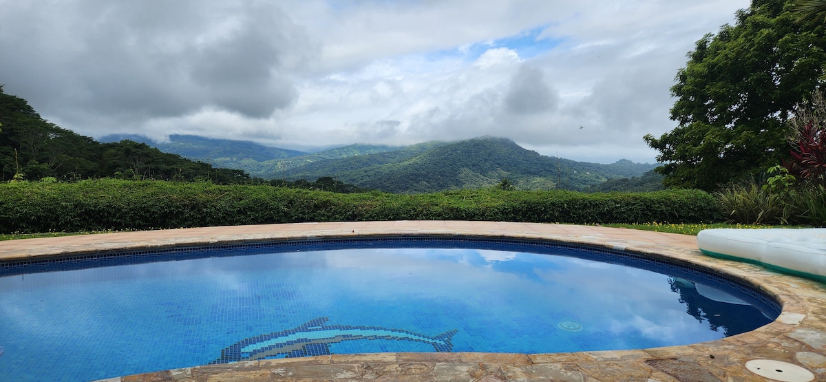 Enjoy this retreat in the hills of Dominical. Relaxation and fun are welcome, loud music and parties are not. Surrounded by mountain ridges and jungle, modern comforts and a view of the ocean from the private pool await you. Depending on the time of year, there are many animals to see including monkeys, sloths, parrots, toucans, lizards and more! Please note it’s not in Dominical, it’s 2.8km up a mountain road from Dominicalito beach. 4x4 vehicle required to access property.