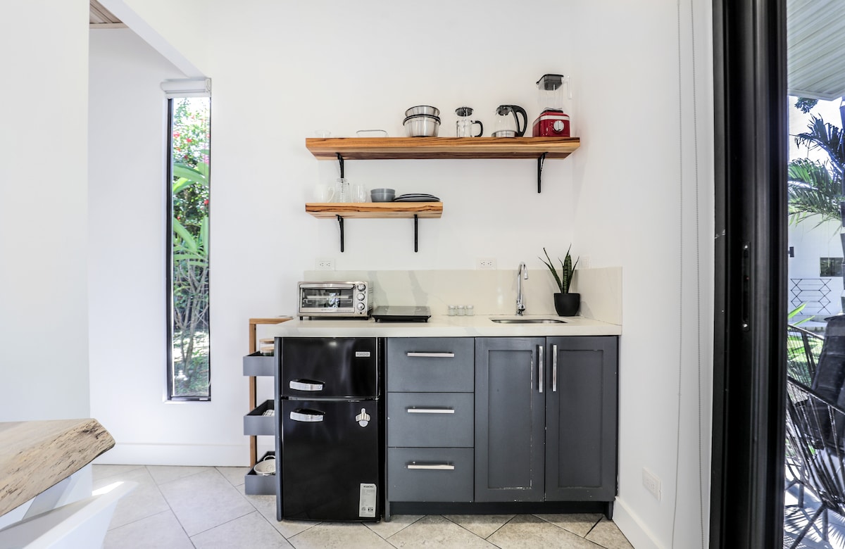 Un espacio cómodo y bien diseñado, ideal para descansar y disfrutar de Uvita con todo lo necesario. Cuenta con cama matrimonial, baño privado con ducha y un ambiente tranquilo pensado para desconectar. Incluye aire acondicionado, Smart TV y Wi-Fi de alta velocidad. Además, dispone de mini refrigerador, microondas y cafetera, ofreciendo mayor autonomía durante tu estancia.