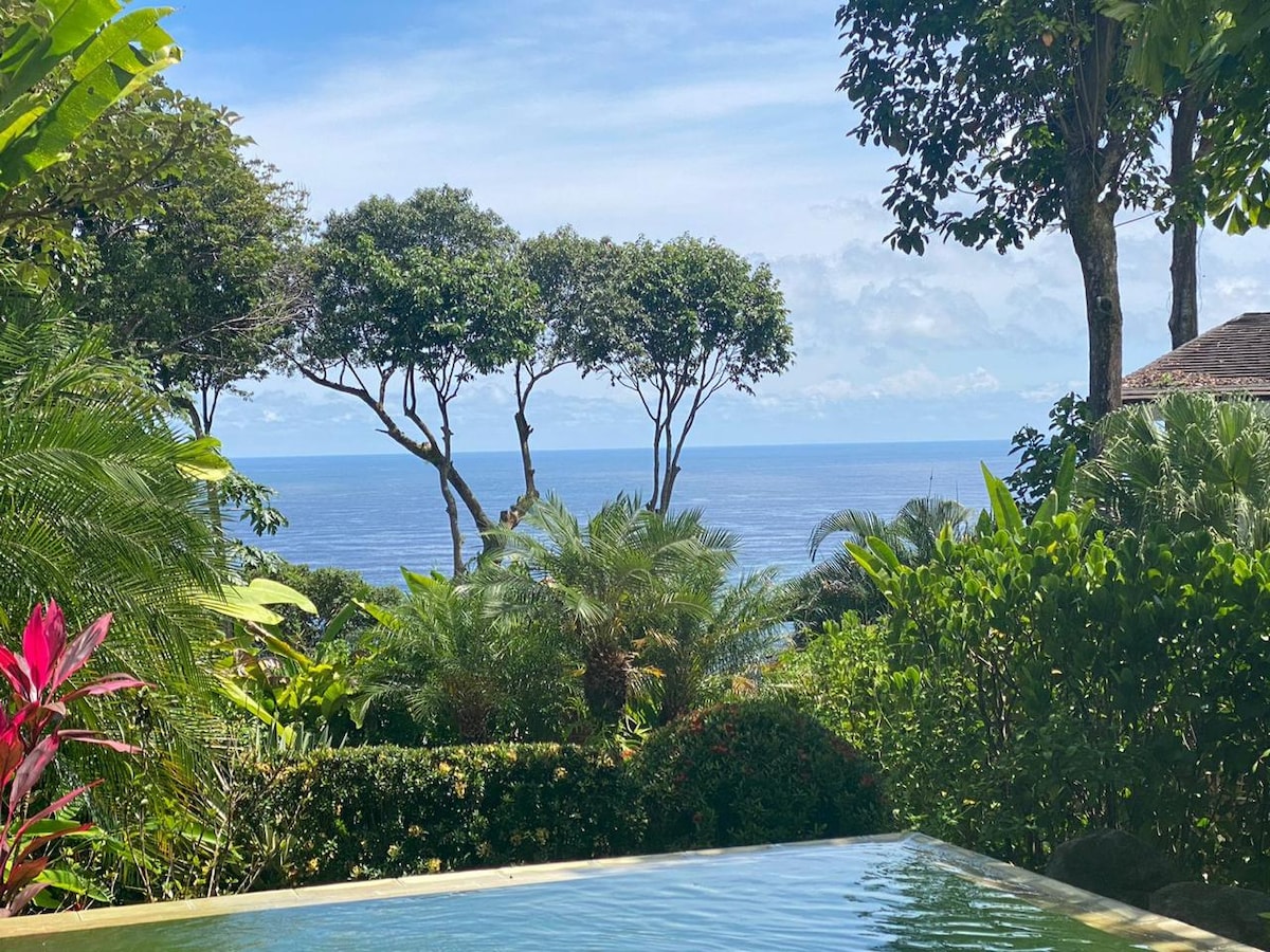 You'll fall in love with Casa Mariposa's privacy, tranquility and fabulous Pacific Ocean and rainforest views. This elegant, luxurious, gated, comfortable house on 5.5 acres of rain forest is 700 feet above sea level in a quiet community near Parque National Marino Ballena. Close to dozens of restaurants, tours, shops and gorgeous beaches, a convenient 8 minute drive from the beach highway, 4x4's required. Message me to have our concierge arrange curated tours, private chef and spa services!