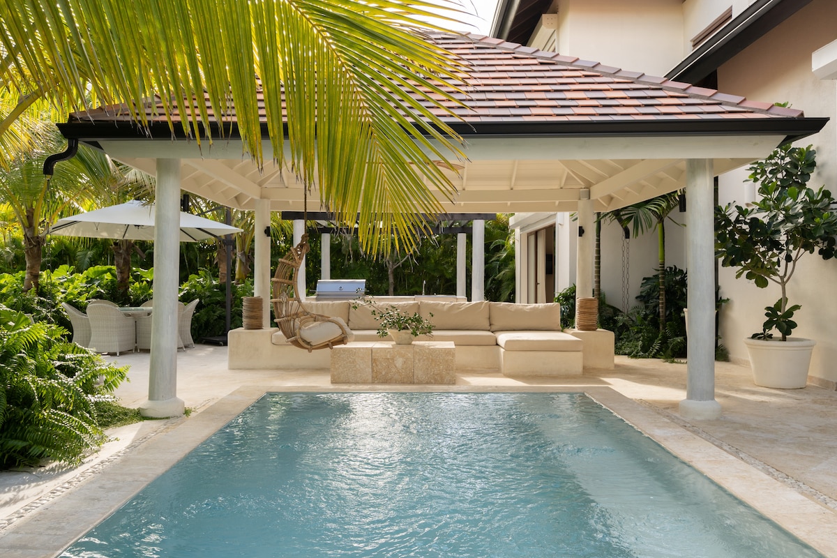 Villa Magua is an oasis where you can sip your morning coffee with a delicious breakfast while taking in a stunning view of the lush garden filled with palm trees. The villa offers daily maid service, breakfast prepared by a Dominican cook, and a villa manager available for an stress-free stay. To enhance your experience, a four-person golf cart and two e-bikes are included with the rental, making it easy to explore Cap Cana at your leisure.