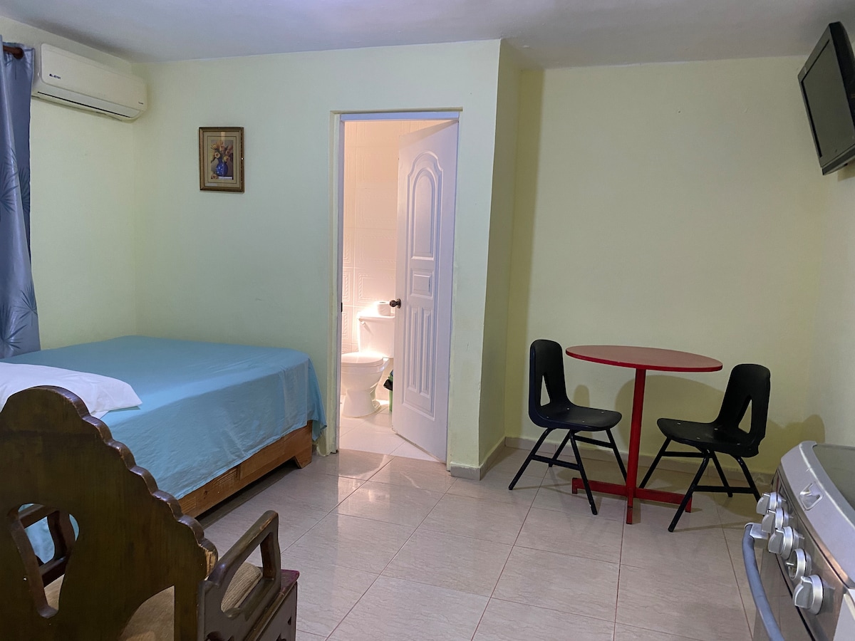 No smoking 🚭 allowed / Prohibido fumar 🚭 Very centrally-located first floor studio 🤩, within walking distance to Plaza Zona Rosa, Agora Santiago Center and many of the best restaurants in town. Located in a privileged area “Las Trinitarias”, minutes away from restaurants 🥘, night clubs 🍹, bakeries 🧁, supermarkets 🛒 and many other places. With one queen bed, 300Mbps WiFi connection, 🅿️gated parking space, water heater, AC ❄️, kitchen, Large TV, all the basics! and backup power 💡