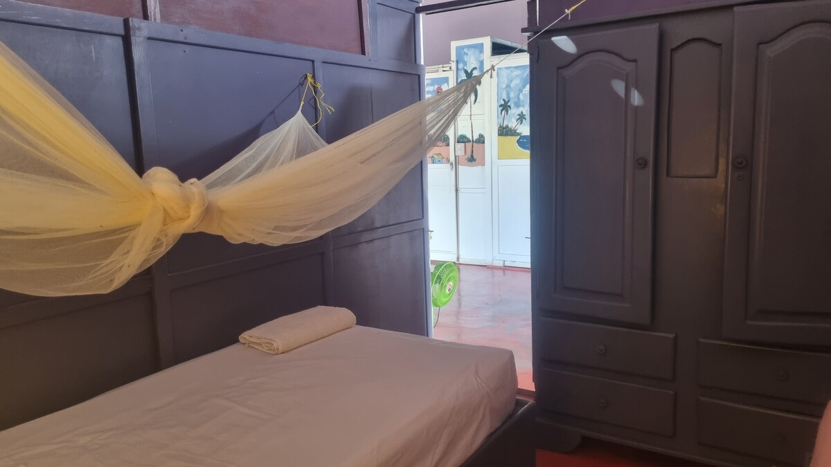 Our budget-friendly haven features a private bathroom, a gentle fan, and a handy fridge. Stay connected with complimentary internet. Pillows, towels, and sheets cocoon you in comfort. Nestled in a vibrant neighborhood, our personalized service ensures you feel at home. A clean private room with BASIC necessities, a great location. Our Guesthouse is located less than a minute's walk from Las Ballenas beach