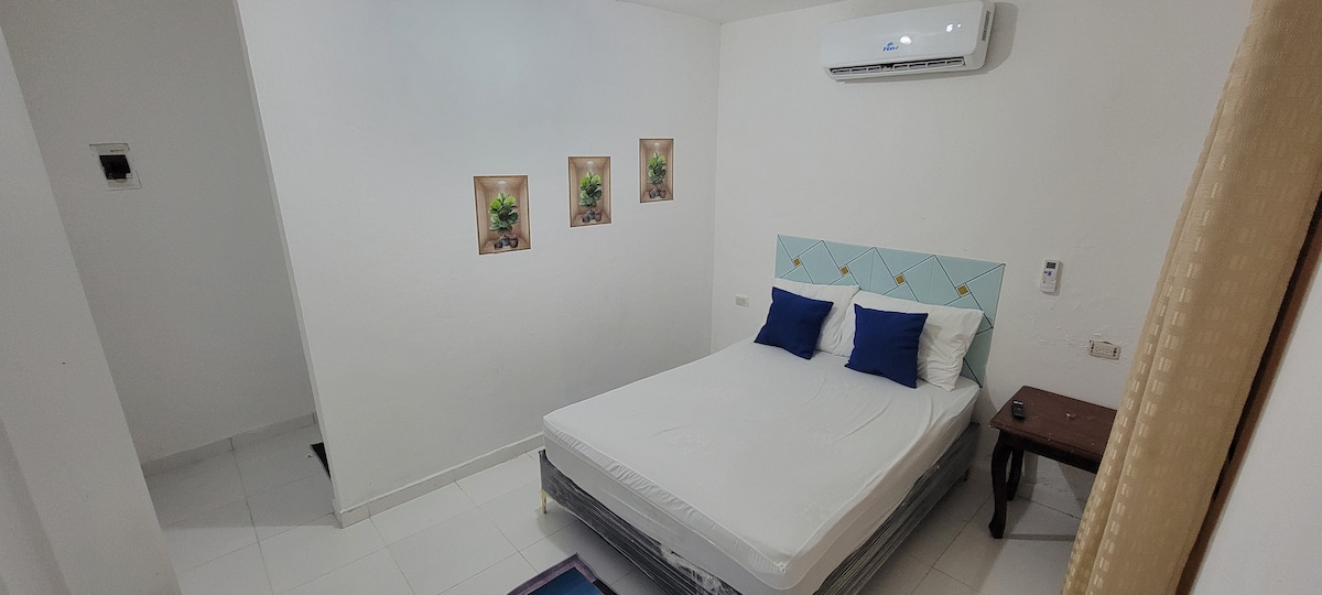 Este cuarto acogedor de estilo colonial cuenta con una cama matrimonial cómoda y una decoración minimalista en tonos cálidos con detalles en azul. Incluye un baño privado compacto, equipado con agua caliente, un elegante espejo redondo y una ducha práctica. El espacio también ofrece aire acondicionado. Ideal para quienes buscan comodidad y funcionalidad mientras exploran la ciudad.