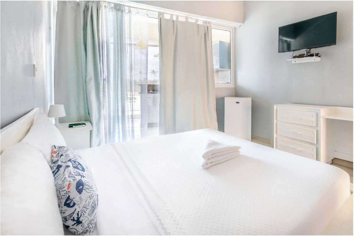 A hidden gem! Located in central Cabarete directly on the beach. This beautiful apartment is located just a few minutes walking distance to restaurants, shopping, & bars. Not only being a great location, this room offers an exquisite view of the ocean! This rooms offers all the amenities you will need to assure a relaxing, peaceful vacation in paradise. On site we also have a Restaurant, Bar, Gym, and Spa! *Breakfast is also included in your stay.