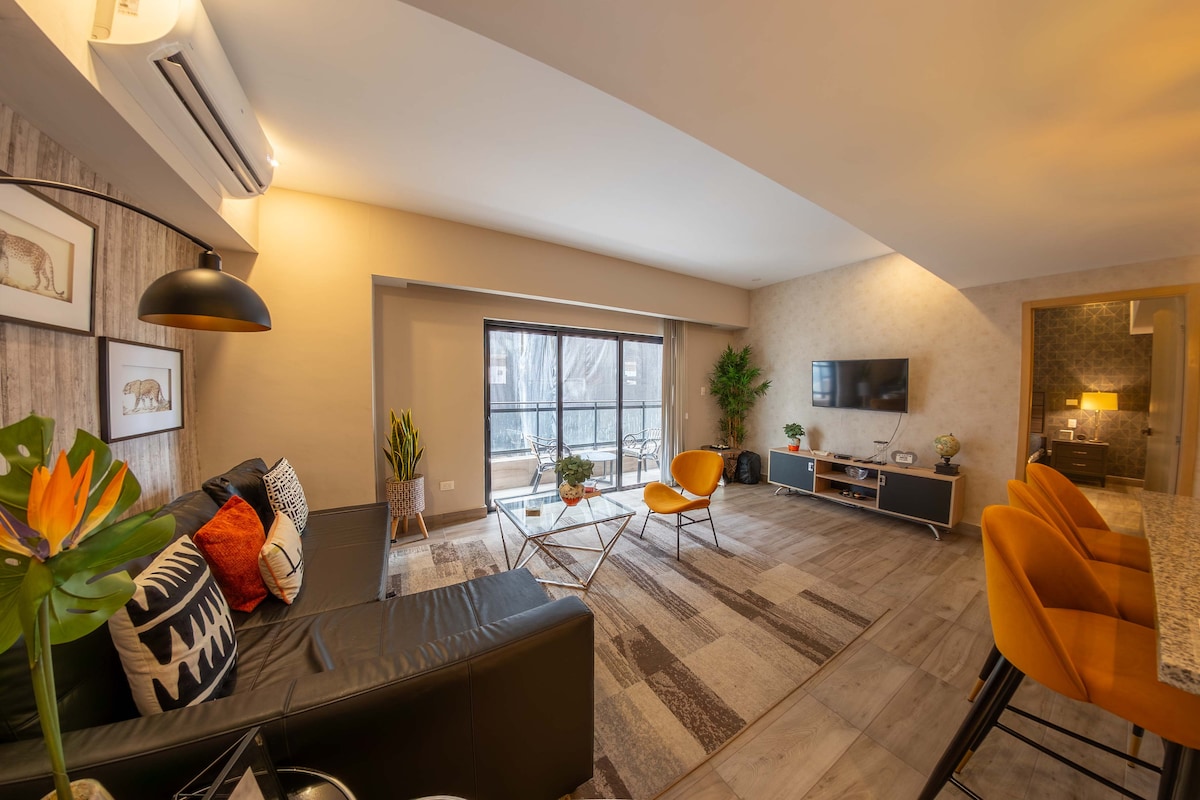 Stay in this beautiful and practical apartment with full furnished, Air conditioner, 1 bedroom with King size bed, walking closet, TV, WIFI and Netflix included. Full equiped kitchen, living room with TV and AC with a confortable sofabed for your family. Located in the heart of the city and very close to many restaurants, bars, supermarket and malls. If a service animal is accompanying, proof needs to be provided prior to booking. *** Scan QR For Virtual Tour ***