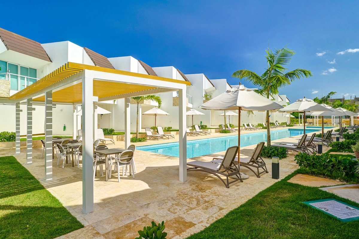 Wake up to pool views in this private poolside condo located in the exclusive Playa Nueva Romana community. Just a 2-minute walk to the beach, this home offers the perfect blend of relaxation, comfort, and resort-style living. Enjoy two spacious en-suite bedrooms, a fully equipped kitchen, open living spaces, and direct access to huge pool and private covered terrace with grill all within a secure, gated community with 24/7 security.