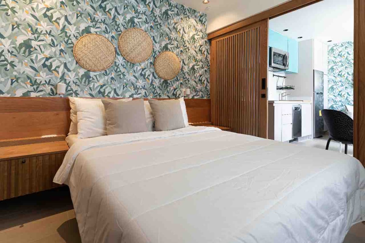 Disfruta del encanto de este céntrico alojamiento en el 9no. piso de impresionante Torre, decorado con elementos modernos y muebles confortables. El apto cuenta con una habitación, cama King, Televisor Smart, sala y cocina espaciosa, 1.5 baños, lavadora secadora y aires acondicionados en todas las áreas. También cuenta con Piscina, Terraza al aire libre con Bar, gimnasio y área de juego para niños. La cocina está equipada con todo lo que necesitas para sentirte en casa.