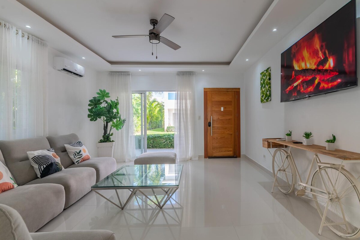 Nestled in a peaceful area of Punta Cana, this 3 bedroom condo provides a serene escape from the bustling world outside. Surrounded by lush greenery and tranquility, the property offers ample space to accommodate guests, making it ideal for families or friends seeking a memorable time. Experience pure relaxation and indulgence on the terrace, and enjoy the enchanting view of the lush garden, or dine while soaking in the serene atmosphere. Beach Arena Gorda, is located less than 1 km away.