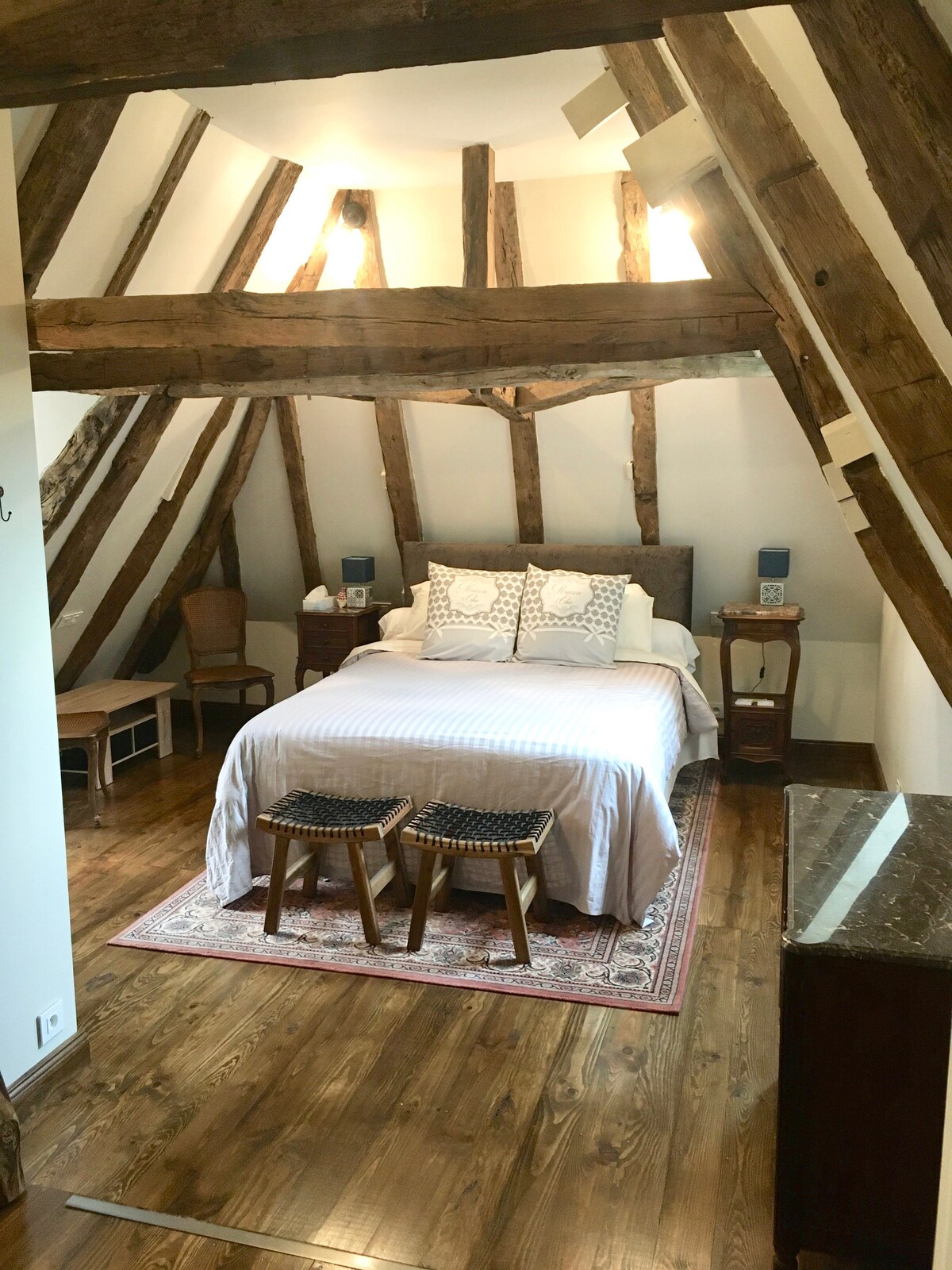An amazing creatively restored 80 sq m open room in a medieval barn, above the owners inspirational sculpture / textile sudios. Solid oak floors, original timbers with a private shower room downstairs. Set in a floral garden with over 200 plant varieties, described as "a bubble of paradise" in a tiny hamlet just 10 minutes from Terrasson/A89. For extra a real Scottish homemade"girdle pancake" breakfast, under the marquee, served on ceramics made on the premises. A unique artistic experience.