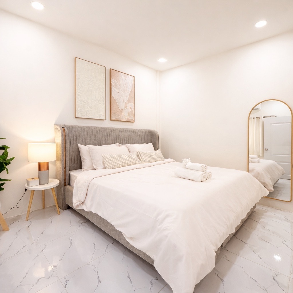 The lovely little home is a cozy minimalist house with 2 bedrooms and 2 bathrooms, and two sofa beds. designed to feel warm, simple, and comfortable. Just minutes from the BTS Green Line (Sai Yud Station), with easy access to the city. The area is surrounded by many Thai restaurants and coffee cafés, lively both day and night. The house is fully air-conditioned throughout, perfect for couples, families, or friends looking to relax and experience local living in a calm, charming space.
