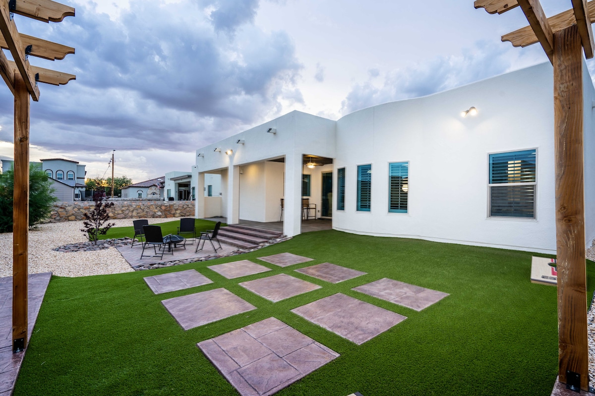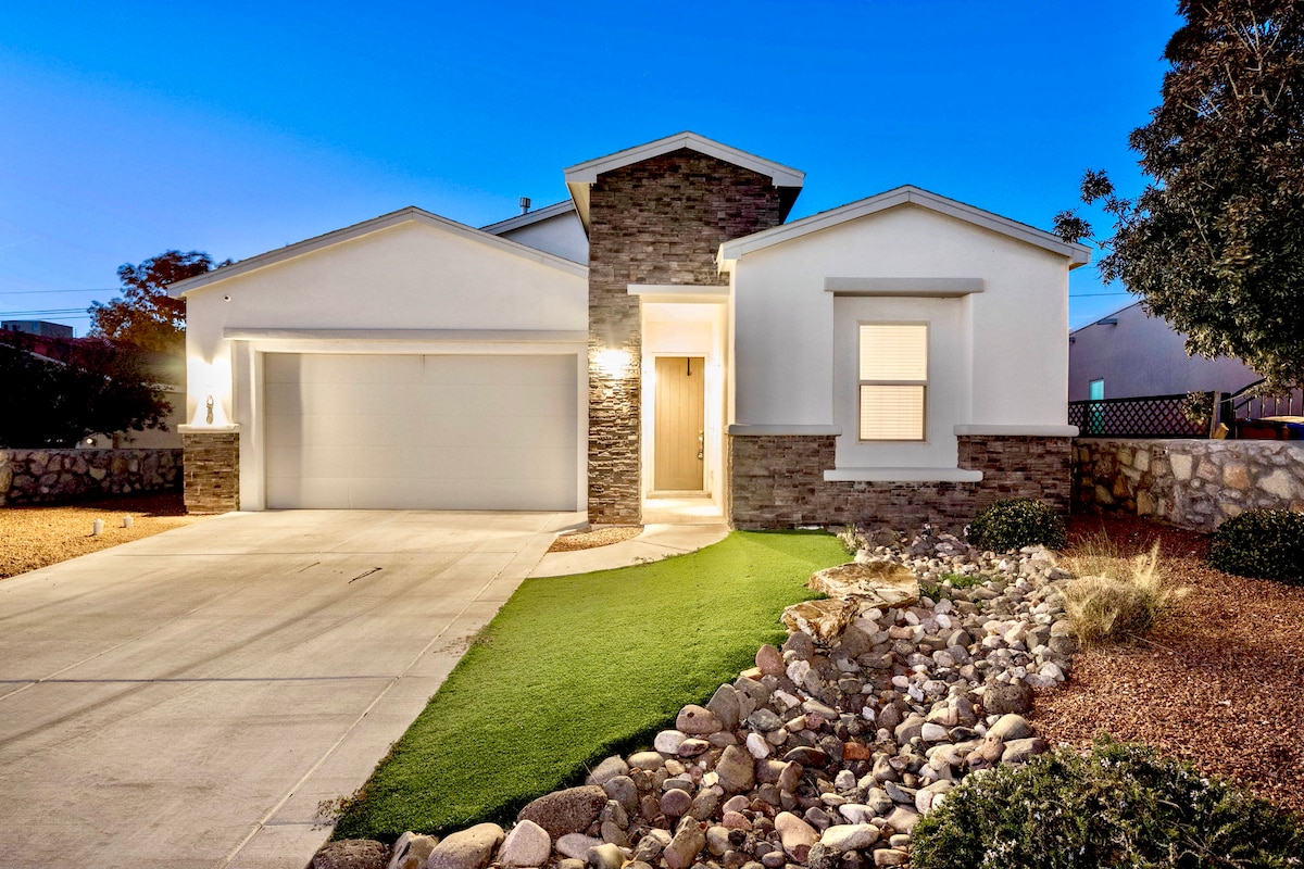 Brand new home, with a beautiful view of the Organ mountains located right across the street from a water park for unlimited free fun in the spring and summer and most park activities year round. Close to NASA and White sands missile range. 5 min. From the fwy & shopping ..10 min. From downtown. Incredible sunsets, peace and quiet, a place to recharge your batteries. New appliances.. gourmet kitchen..comfortable beds.. custom shower.. Private landscaped back yard...Your home away from home.