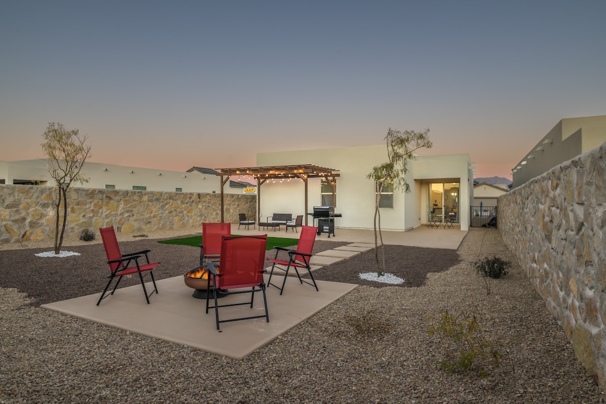 Pecan Palace: luxe 4-BR near NMSU & White Sands. Tucked by pecan farms, this new retreat blends comfort + fun. Perfect for families, work trips, extended stays. ☞ EV charger ☞ Backyard hot tub under pergola ☞ Climate-controlled game lounge with pool table ☞ Foosball ☞ Poker ☞ Pac-Man ☞ Fully equipped chef's kitchen ☞ Plush bedrooms with blackout curtains ☞ Prime spot—1.5 mi to NMSU, Interstate I-10, dining & shopping ☞ Easy access to White Sands NP and downtown