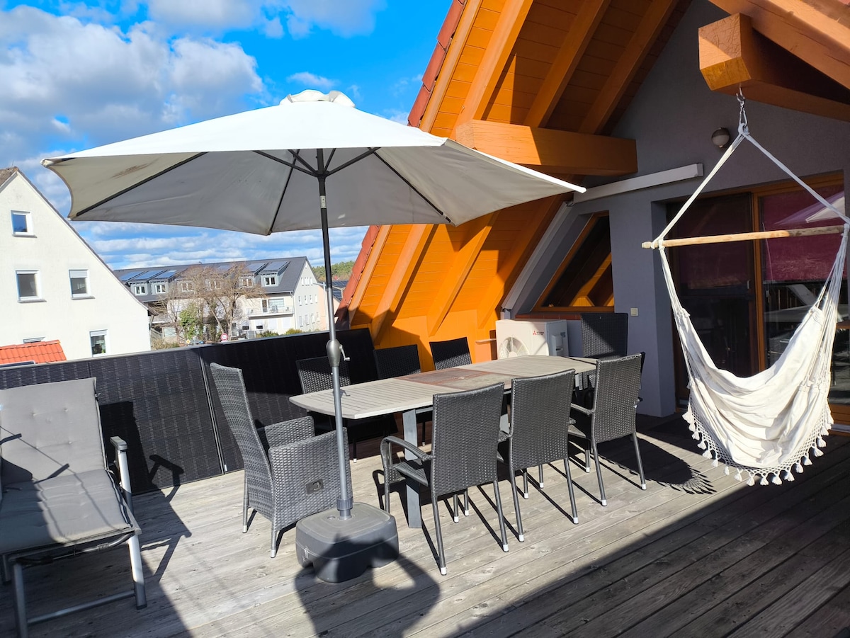 Welcome to our loft! Enjoy your stay with a large kitchen, large living room, large bedroom and modern bathroom! - Suitable for business trips and families - kitchen with refrigerator, stove, dishwasher, coffee machine, kettle, toaster, microwave - 2 x TV (living/bedroom), Blue-Ray & Highspeed WLAN - Parking spaces in front of the house - Playground 2 minutes - 30 min. Exhibition Nuremberg - 25 min. Franconian Lake District - 20 minutes Playmobil Funpark - 45 minutes Rothenburg/Tauber