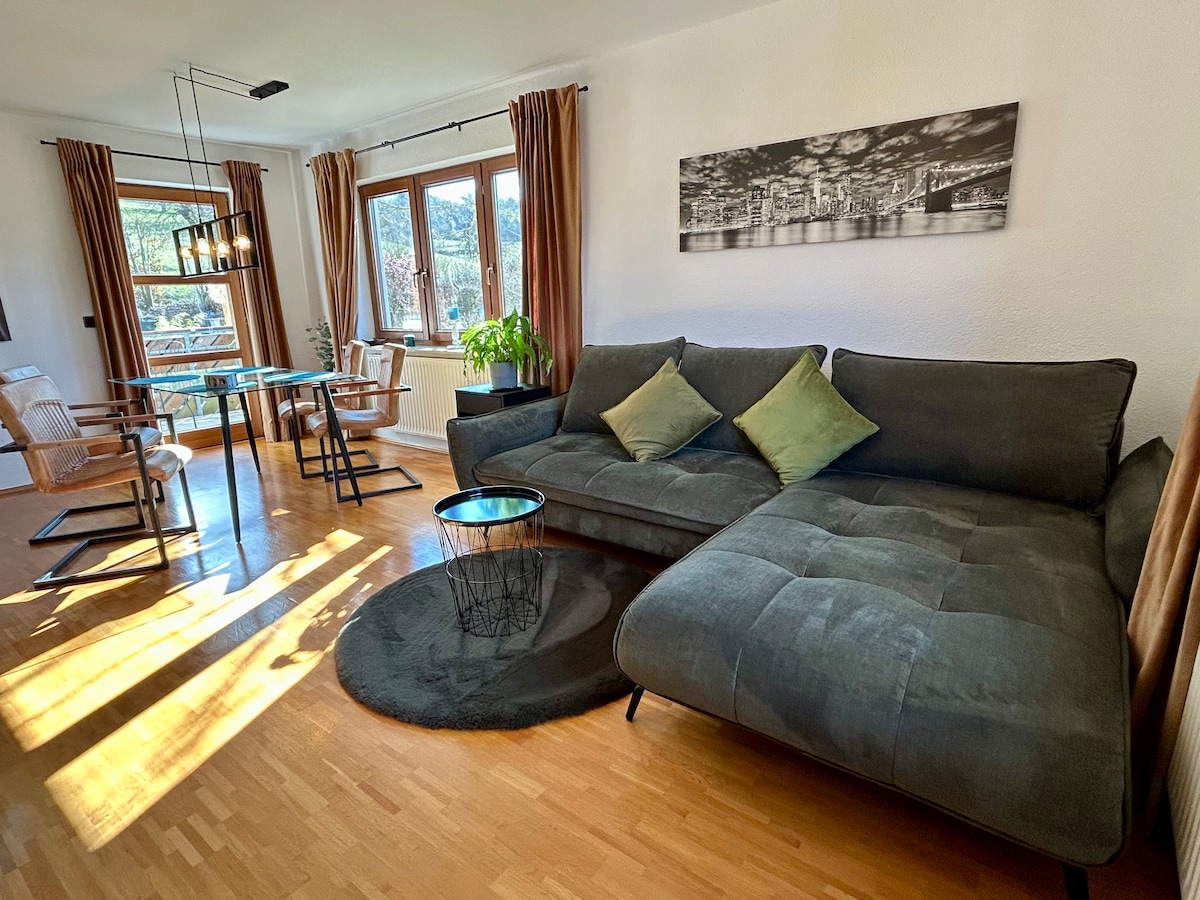 Beautiful, barrier-free 2-room apartment in an ecological wooden house. Private terrace, located on the outskirts of Gräfensteinberg between Brombachsee and Altmühlsee, opposite the “Drei Eichen,” with beautiful panoramic views. Playground only 200 m away. Dogs welcome. Both lakes can be reached within 10–15 minutes by bike. Fully equipped kitchen. Local village shop within walking distance. Outdoor sauna, 2 e-bikes with Thule Cab2 trailer and EV wallbox available for an additional fee.