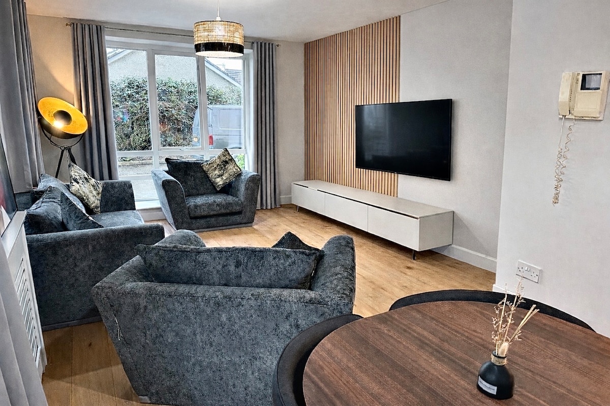 This listing is available to couples and families, not suitable for groups of friends/parties. This modern apartment is south facing, so has sunlight streaming in all day long. Located downstairs, it has its own entrance via a front door. There is a large patio area that is lovely and warm on sunny days. Inside, there is a large smart television, extendable dining table and comfortable sofa. There is a full length mirror inside the large wardrobe which is perfect for those attending functions.