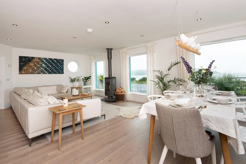 This newly built modern 2 bedroom property is perfectly situated just steps from a private beach. Accommodation is very spacious with high ceilings throughout and comprises an open plan kitchen, dining & living area with vaulted ceiling, utility, WC, two bedrooms - a twin room and a master ensuite. 5G Wifi. The property has sensational sea views and looks out onto Inishfree island and Arranmore island. As the day fades, the lights of Arranmore provide a magical vista.