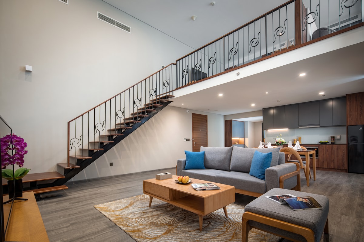 This unique penthouse-styled duplex has a style all its own in the West Lake area, right next to Nhat Tan Bridge. Indoor gym & pool are inside the building with restaurant and nearby biggest Lotte Hotel in walking distance. (On 11th Floor)