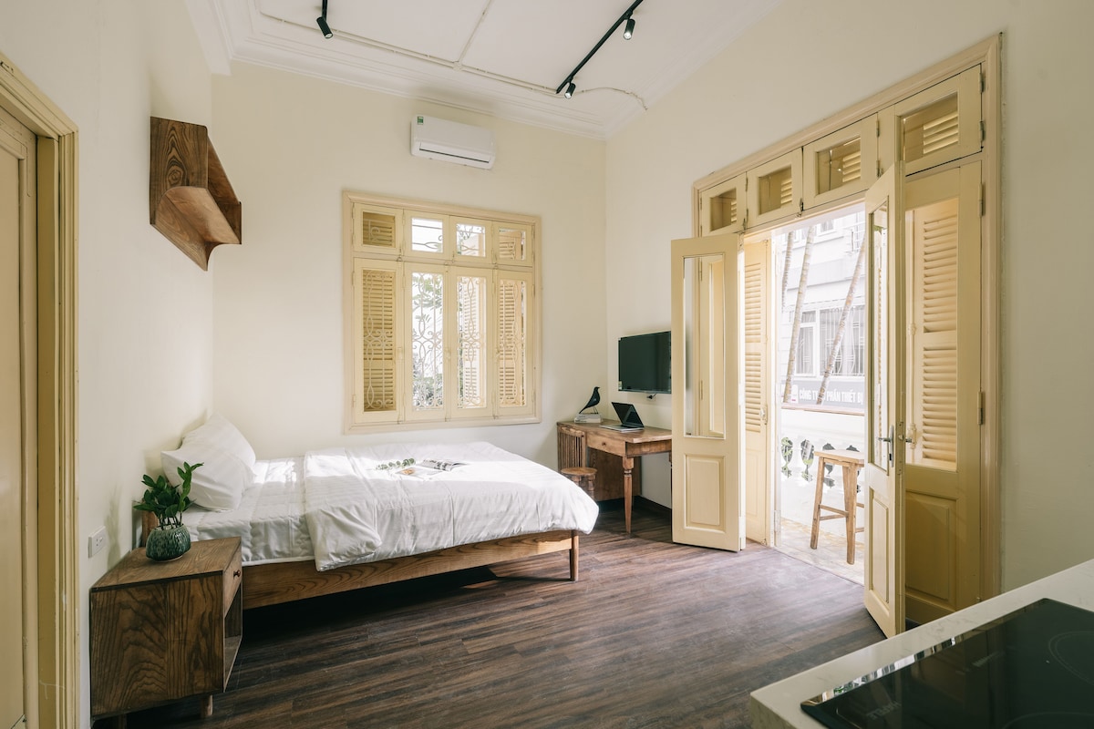 This cozy, clean and spacious studio is 30m2 with 01 bedroom, 01 small kitchen, 01 laptop work space, and 01 attached private bathroom, located in a small alley, only 50m to the main road. It boasts 2 big windows so the rooms are most naturally bright and airy. The studio is an ideal choice for groups of 1 – 2 people. It is in a central location with local neighborhood, very close to big lakes, parks, bus stops, supermarkets, restaurants…, and especially just 3km from Hanoi’s Old Quarter.