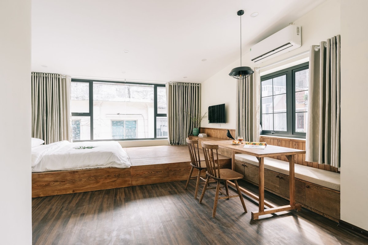 This cozy, clean and spacious studio is 30m2 with 01 bedroom, 01 small kitchen, 01 laptop work space, and 01 attached private bathroom, located in a small alley, only 50m to the main road. It boasts 2 big windows so the rooms are most naturally bright and airy. The studio is an ideal choice for groups of 1 – 2 people. It is in a central location with local neighborhood, very close to big lakes, parks, bus stops, supermarkets, restaurants…, and especially just 3km from Hanoi’s Old Quarter.