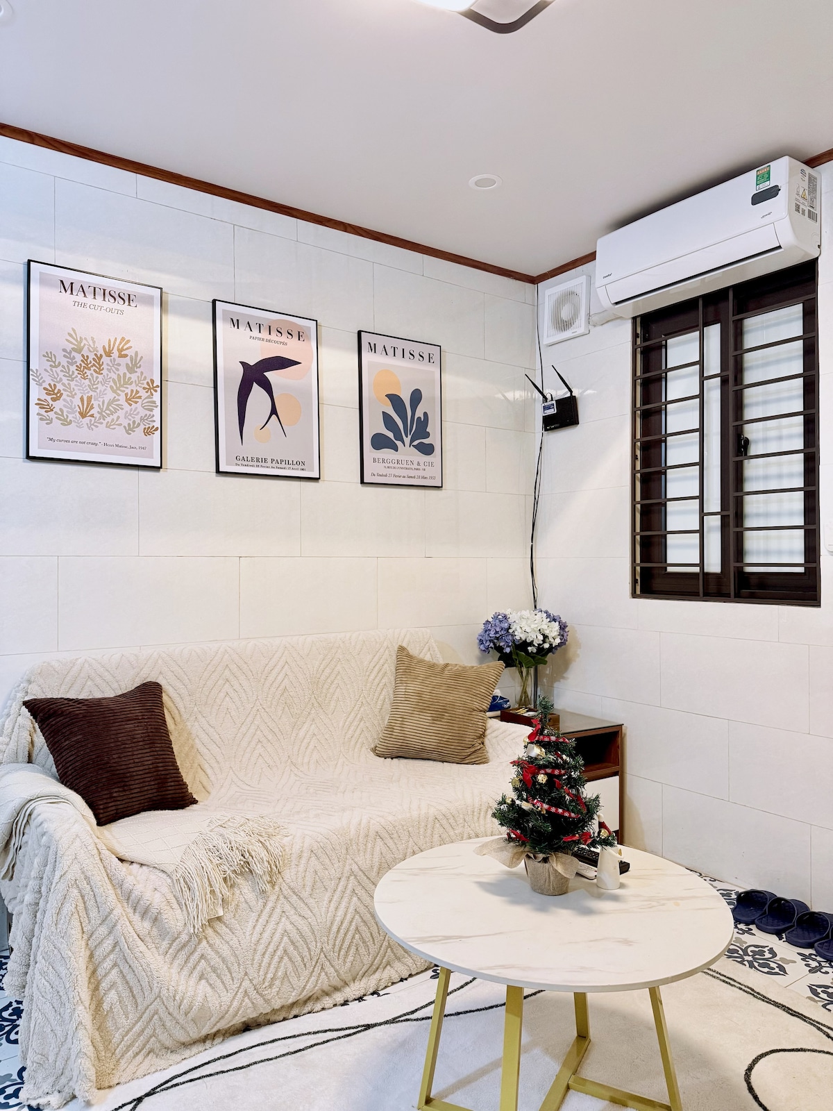 The appartment is tucked away in a quiet little alley, paved with vintage encaustic tiles — a style that’s quintessentially old Hanoi. The alley is peaceful, and you might occasionally see a few neighbors cooking outdoors in the shared courtyard. Right next door lives a musician; sometimes he leaves his door open, and you might catch the soft sound of music or gentle conversations drifting through the air — a little touch of Hanoi’s soul.