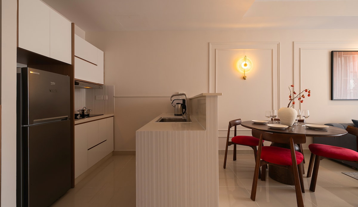 Căn hộ được thiết kế sang trọng với tầm nhìn skyline toàn cảnh thành phố, mang lại không gian thoải mái và hiện đại. Vị trí ngay trung tâm nên rất thuận tiện di chuyển, xung quanh có nhiều siêu thị, cửa hàng tiện lợi, quán cà phê và nhà hàng nổi tiếng. Có thể dễ dàng đi bộ đến công viên và nhiều địa điểm tham quan du lịch trong khu vực, chỉ vài phút đến Bitexco Tower. Phù hợp cho kỳ nghỉ thư giãn, khám phá thành phố hoặc chuyến công tác ngắn ngày. Không gian đầy đủ tiện nghi cho một kỳ nghỉ.