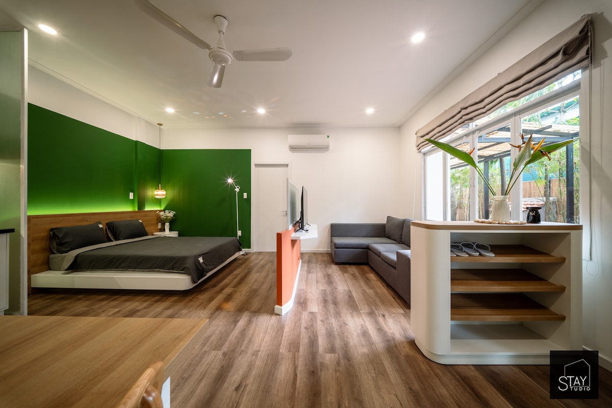 Elegant riverside studio with premium furnishings and a full kitchen. Pet-friendly, with 24/7 security, keycard access, and weekly cleaning. Free WiFi, motorbike parking, laundry & dryer. Pool, BBQ area, and functional room for yoga, fitness, or workshops (projector available). Car parking (surcharge). Utilities surcharge for 7+ nights. Check-in 2 PM, out 12 PM. Passport required at check-in.