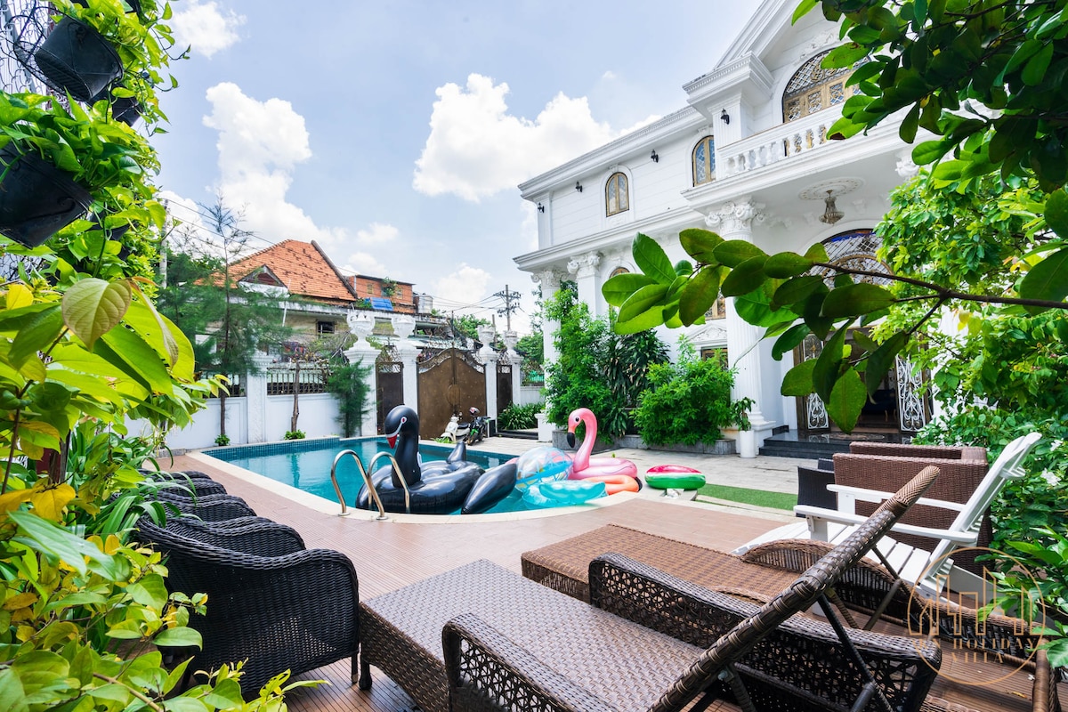 Villa tân cổ điển châu Âu, sang trọng, yên tĩnh giữa lòng thành phố. Gồm 1 hầm, 1 trệt, 2 lầu, 9 phòng ngủ (WC riêng), thêm 2 WC ngoài. Phòng khách trần cao, nội thất cao cấp, piano grand. Giải trí với karaoke âm thanh vòm, bida, hồ bơi mini trong nhà. Phòng ngủ rộng, ban công xanh mát, bồn tắm thư giãn. Bếp đầy đủ, BBQ ngoài trời, vệ sinh miễn phí, hỗ trợ check-in 24/7. Lý tưởng cho gia đình, cặp đôi, nhóm bạn. Rất hân hạnh đón tiếp quý khách! Trân Trọng!