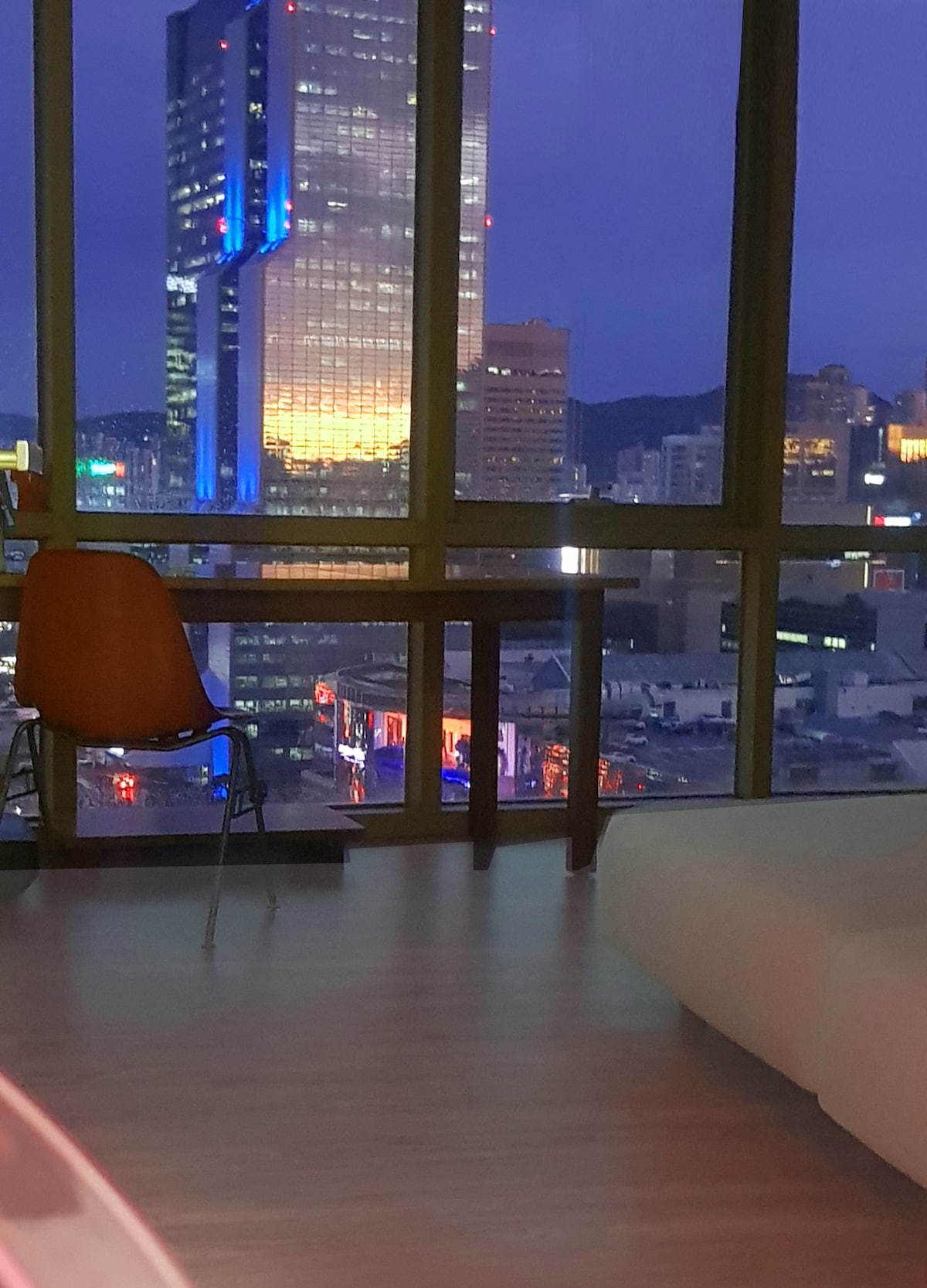 SEOUL SKYLINE from TOP FLOOR Panoramic Landmark : Hangang River, Seoul N Tower, and Lotte Tower On the Move: Walk 10 secs to Bongeunsa Station (Line 9), 10mins to Samseong Station (Line 2) From Airport: Take AREX and Line9, or Airport Bus Urban Essentials: COEX Shopping Mall, Grocery Shops nearby Cultural Connection: 5 mins to the historic Bongeun Temple (Oldest temple: Founded in 794) Design Touch: This place was designed and renovated by K-pop Star, Got7
