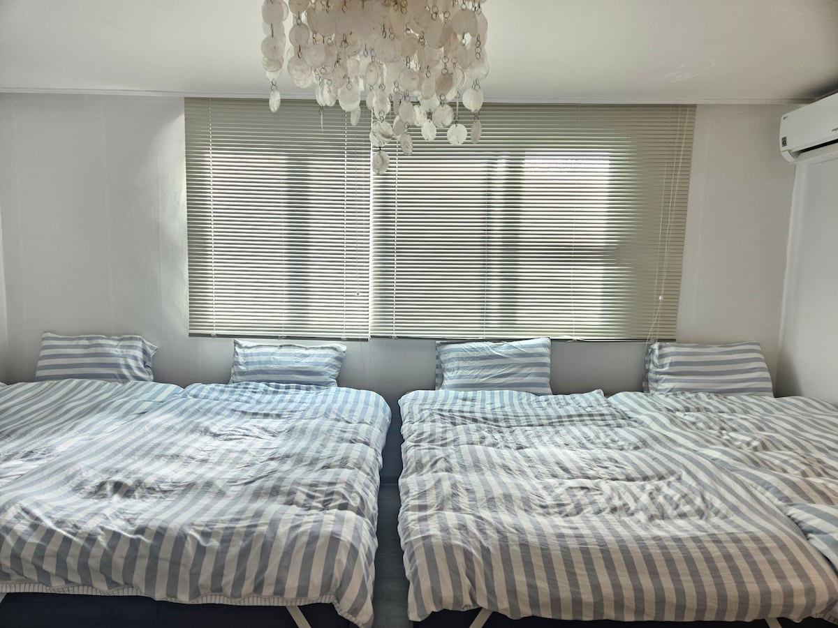 💜 신축건물 조용한 주택 2층 입니다. 💜 깨끗하고 사랑스런 컨셉의 퀄리티있는 숙소를 거품없는 가격으로 제공하고 있습니다. 💜 23평 넓고 쾌적한 공간. 호텔식 침대 및 침구. 6인 대형 테이블이 마련된 독립 다이닝룸. 50인치 스마트 TV (유튜브, 넷플릭스, 티빙 개인계정 시청가능) 💜 예약인원 외 추가인원 입실 불가. 적발시 환불 없이 즉시 퇴실 조치 (방문인원 입실불가 ) ※ 공동현관 CCTV로 체크합니다. 💥1~2인 예약시 : 침실1 또는 침실2 중 선택 (기본 침실1 제공) 제공외 침실 CLOSED 침실1, 2 모두 사용시 1박당 3만원 추가요금 발생 💥 3인 예약시 : 침실1 + 침실2 (슈퍼싱글 침대) 💥 4인 예약시 : 침실1 + 침실2 (슈퍼싱글+싱글침대)