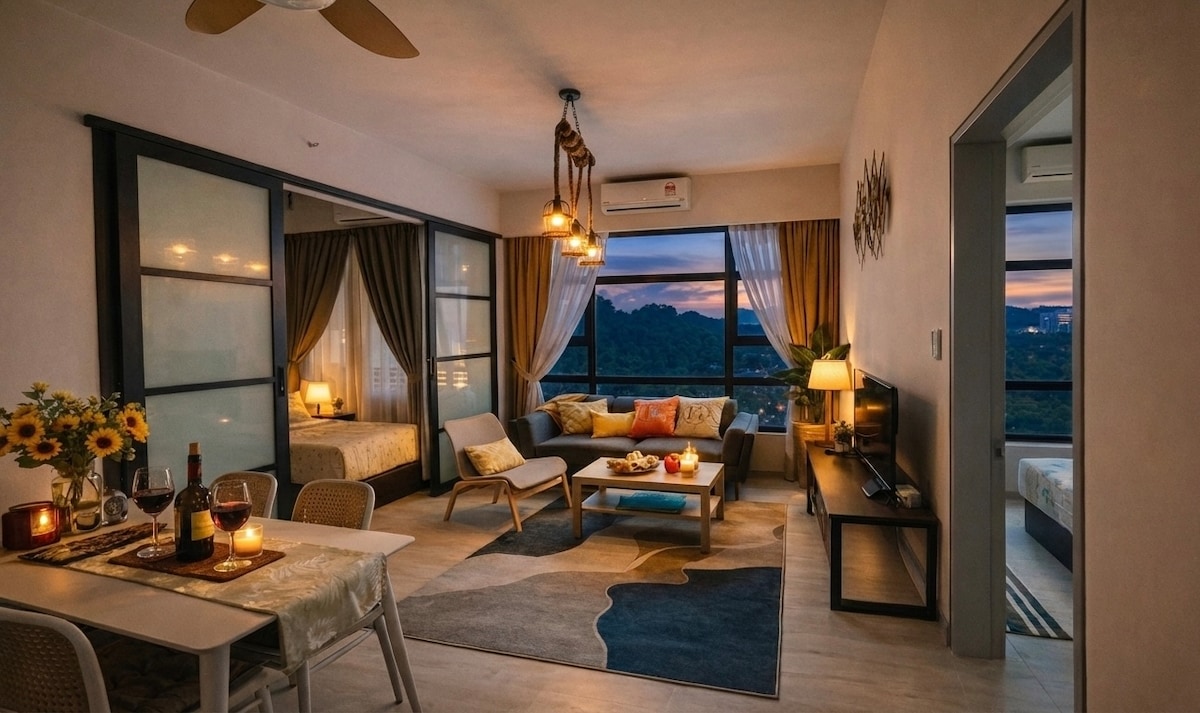 Stunning Sea view from the house. Chilling at the balcony. Swimming pool@level 6 Living Room, Queen Size bedroom, private sofa bed corner with curtains. Ensuite bathroom with hot and cold water shower. Large refrigerator with ice cube , mini kitchen with electric cooker, pot,plate,spoon,fork are available . Light cook at the kitchen. Filter water machine hot and warm. Please select 3 guest if you need single bed setting convert from sofa bed.