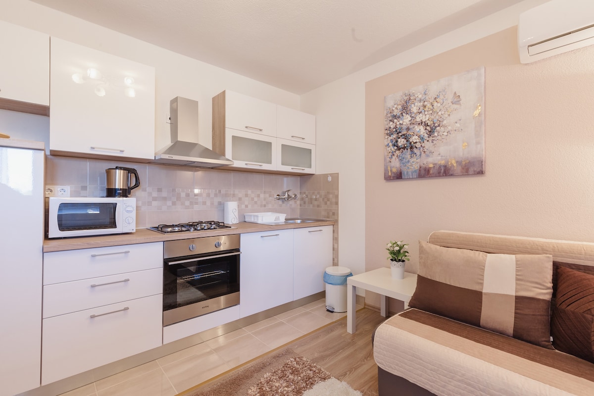 The apartment accommodates up to 4 people. It has 1 bedroom, a kitchen/dining area/sleeping area, a bathroom, and a balcony. The kitchen is supplied with basic cutlery, plus a kettle and a microwave. There is a big TV situated on the wall of the bedroom, and a wardrobe containing extra sheets, blankets and pillows. The bathroom is supplied with all the basic toiletry. There is AC. Our apartment is 1km away from Rastoke, 30km away from Plitvice lakes, and 6min of walk to the center of the town.