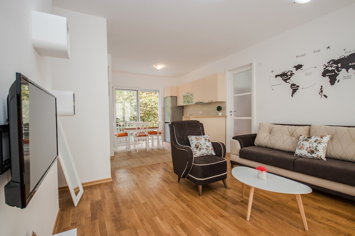 Nov komforan stan,u mirnom dijelu grada,okruzen zelenilom.Stan je udaljen 400 metara od centra grada i 1000 metara od plaze.U stanu mogu da borave 4 odrasle osobe i opremljen je kvalitetnim namjestajem koji pruza maksimalni komfor i udobnost .Obezbjedjena je i podzemna garaza sa sopstvenim parking mjestom,za parkiranje vaseg automobila.Prilikom opremanja stana,maksimalno se vodilo racuna o svim detaljima i obezbjedjen je svim detaljima koji mogu biti potrebni za jednu porodicu.