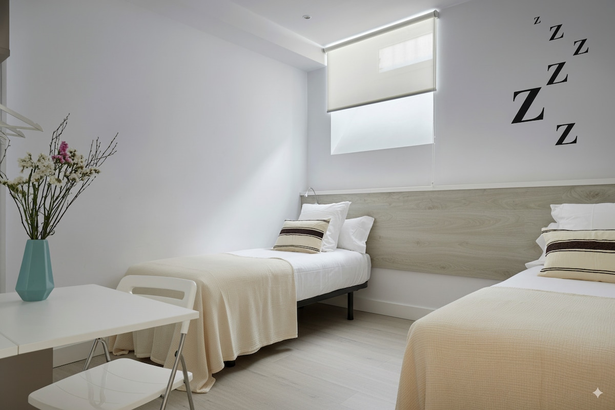 ¿Buscas una opción funcional para dos personas? Esta habitación doble de la Pensión El Puerto cuenta con dos camas individuales y el equipamiento básico para descansar tras un día en San Sebastián. Se encuentra en una estancia cerrada, con una pequeña ventana elevada que da al pasillo interior. No es una habitación exterior ni tiene ventilación directa. Dispone de aire acondicionado frío/calor, wifi, TV, armario, espejo, ropa de cama y toallas.