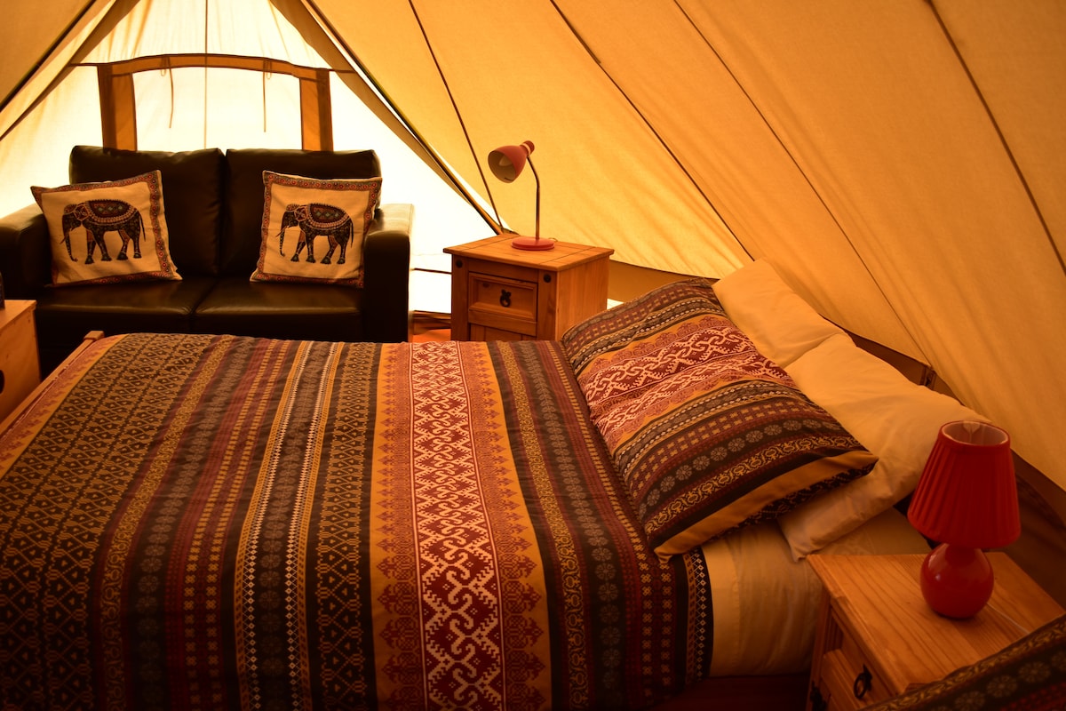 All our Emperor Bell Tents are raised off the ground on timber stands. Each tent has a double Mexican pine bed as standard, matching furnishings, semi-orthopedic mattress, bean bags, bed linen, and towels. Additional fold out beds with bed linen can be included on request. At night the tents are lit up inside by our tea light candle chandeliers and Moroccan lanterns, and outside by solar lights. Accommodates between 2 to 5 persons.