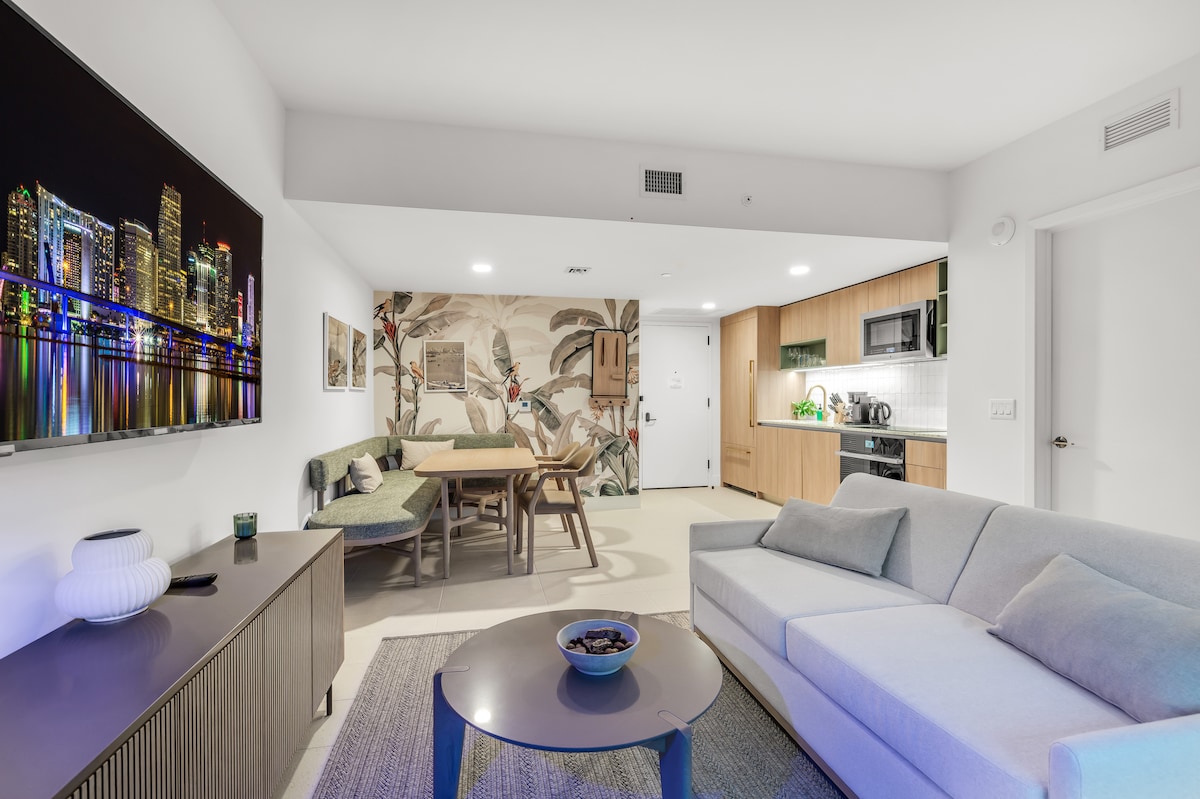 Top floor modern designer Penthouse, two bedroom, two bath, right in the heart of Miami. Enjoy style, convenience, and breathtaking views of Miami from your private wrap around balcony & take in panoramic vistas of the ocean, yachts and city. Kitchen features new stainless-steel appliances. Living room boasts brand new 4K Smart TV with dinning area. Master Bedroom has ultra comfy king size bed + en-suite, stylish Queen room both with smart TV’s. Brand new bathrooms, washer & dryer in Penthouse