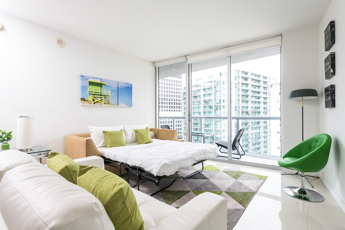Enjoy this centrally-located Penthouse (42nd floor.high ceilings) in the heart of Miami. Mins 2 Bkll City Center, Beaches, Design D, wynwood, n Best restaurants.Tastefully Remodeled n Furnished, Sparkling CLEAN, BRIGHT, modern 1bed 1bath w Amazing CITY VIEWS n Partial Ocean views. Fully equipped Kitchen, Laundry, Cooler n Beach Chairs. King bed n Sofa b. Smart darkening Shade 4 Long nights.Smoking, Pets n Events NOT allowed. Guest must send identification n e-mail to sign registration.