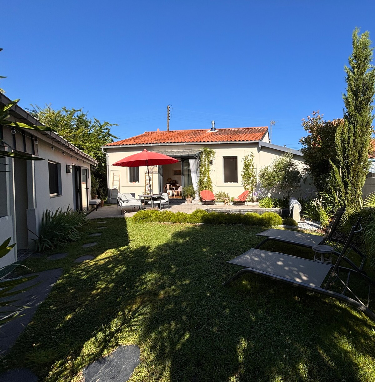 🌿 Studio contemporain entre Bordeaux et l’océan, situé dans un quartier calme à mi-chemin entre Bordeaux (25 min) et le bassin d’Arcachon (40 min). Détendez-vous sur la terrasse verdoyante, partez découvrir les lacs et sentiers à vélo ou à pied, et profitez d’un logement confortable et tout équipé : 🛏️ coin nuit douillet 🍳 kitchenette moderne 🚿 salle d’eau design 🌳 Coin terrasse 🚗 Parking devant la maison sur trottoir Idéal pour une escapade nature ou un séjour professionnel au calme.