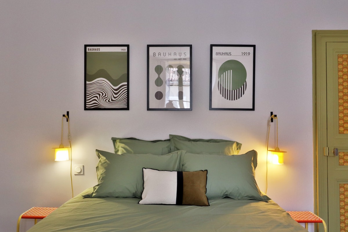 La conservation de certaines tapisseries des années 70 ont inspiré cette chambre aux couleurs acidulées de la POP culture. Chambre double avec lit 160cm - possibilité de la transformer sur demande en twinbed (2 lits simples). Espace salon et bureau dans la chambre. Salle d'eau privative avec WC. La literie et les draps sont de fabrication française; les serviettes de bain sont de fabrication portugaise. Salle commune au Rez-de-chaussée avec salle à manger, salon et cour fermée.