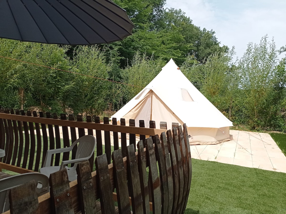 Profitez du cadre charmant de ce logement romantique en pleine nature.le petit déjeuner.(croissant, confiture maison,thé,café, chocolat) vous sera servi sur la terrasse de la tente à l'heure de votre convenance.(14,50€/pers) nous pouvons également vous servir des repas périgourdins à voir avec la chef..le tour de France passera le 11 juillet à proximité. le linge de lit draps couette,ainsi que les serviettes de toilette sont fournis.