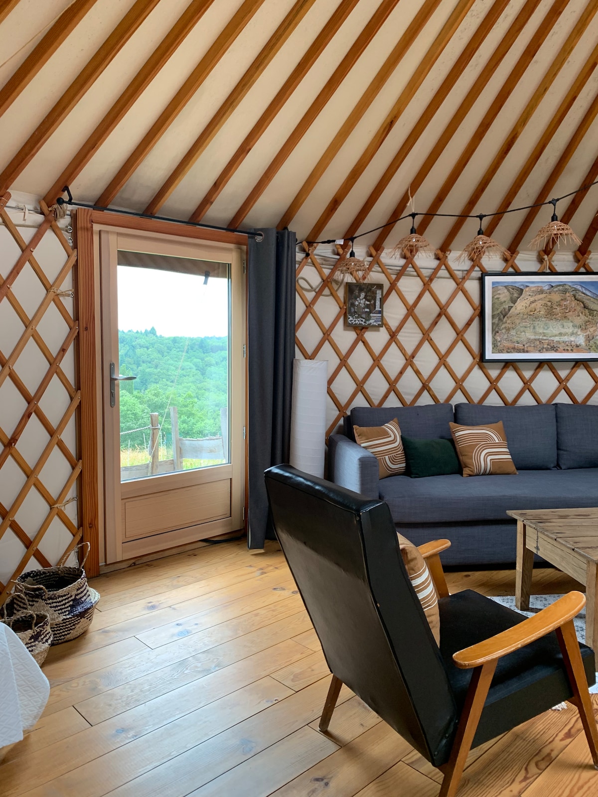 This romantic well equipped yurt with modern conveniences , in a corner of nature far from busy roads , the terrace facing south -view of fields and forests. The yurt , lined with natural hemp and himalayan felt is equipped with a wood stove for a winter get away. no smoking inside . There is a fully equipped kitchen with oven gas cooker, fridge . double bed has a memory foam mattress quilt and pillows, but not sheets or towels. full bathroom on lower level Access via outside