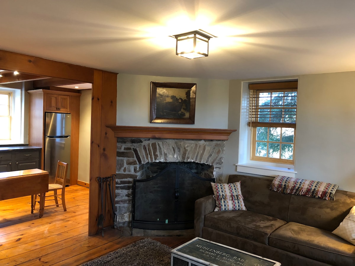 Private, tranquil historic Stone Cottage, situated on 11 woody acres of a colonial Buckingham Hills farm estate, cir 1793 minutes from Peddlers Village, New Hope, Lambertville, Doylestown. Cozy, romantic decorated with unique antiques and comfortable furnishings. Relax by an oversized wood burning fireplace, enjoy a large screen smart TV, explore the property & stargaze by an outdoor fire pit! Retrieve to the 2nd floor spacious master bedroom with an extra plush king size orthopedic mattress.