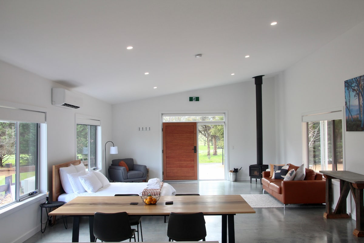 Complimentary champagne! This architecturally designed Barndominium is newly built and one-of-a-kind in the North East of Tasmania. With hydronic floor heating, air conditioning and super-fast wifi, this space is perfect for a romantic getaway or a large group. Tastefully decorated to match the unique design, the mix of old and new will excite! With floor to ceiling windows on the eastern aspect the view down the valley with the morning sun is stunning. Complete with sitting area mezzanine.