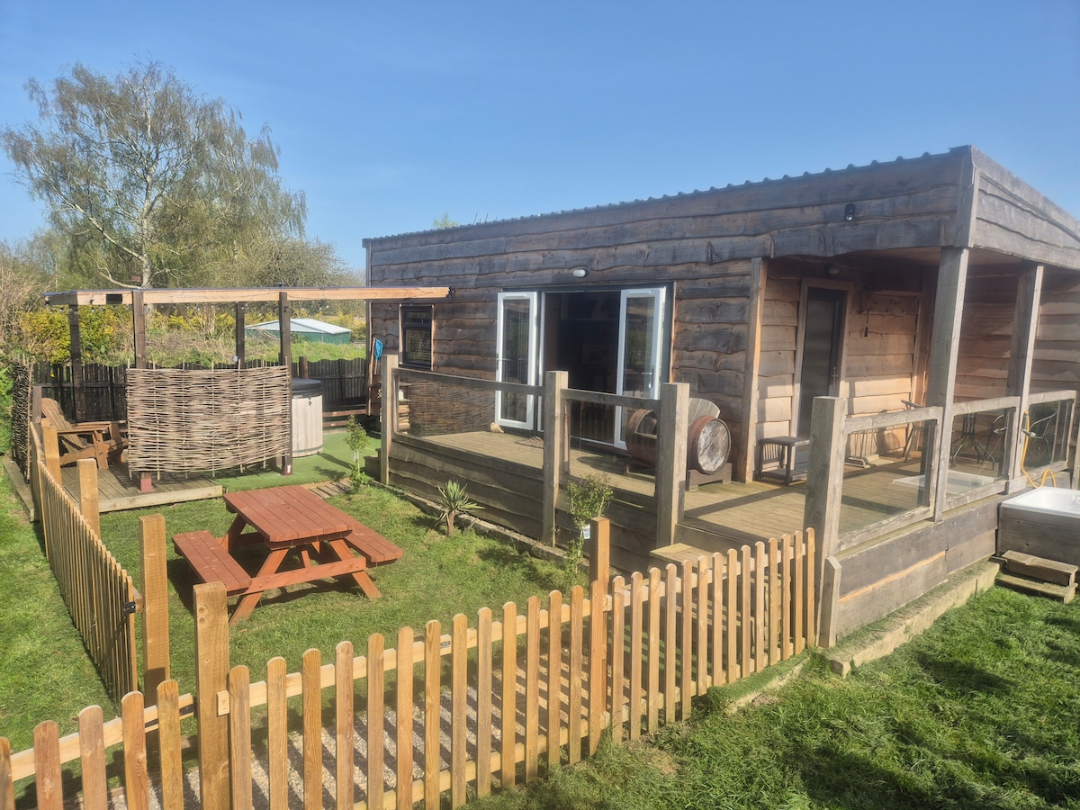 ADULTS ONLY. Bluebell is an idyllic getaway with its romantic feel and stunning lakeside nature reserve view. The hut has a warm cosy double bed, storage, hanging rail, shower,toilet,kitchen with microwave/hobs,tea & coffee,fridge/freezer, Log burner, fire pit,(with 1 set of logs for both) Outside Bath Tub & large decking area overlooking the Lake. Blue bell has had winter up grades to protect you from the rain and also two new sun loungers
