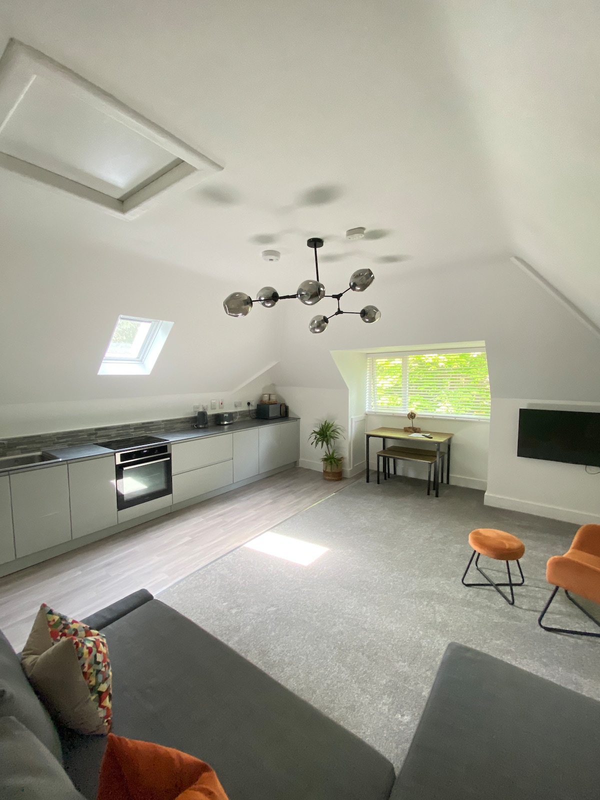 You will be close to everything when you stay at this centrally-located flat. This brand new loft apartment is part of the newly refitted White Properties Group development situated above the Rainbow Store in Lyme. The space is completely new with the highest quality furnishings and finishes. It consists of a kitchen area with electric hob and oven, sitting area with Smart TV and large sofa. This unique, light and airy space offers amazing views just a stones throw from the water.