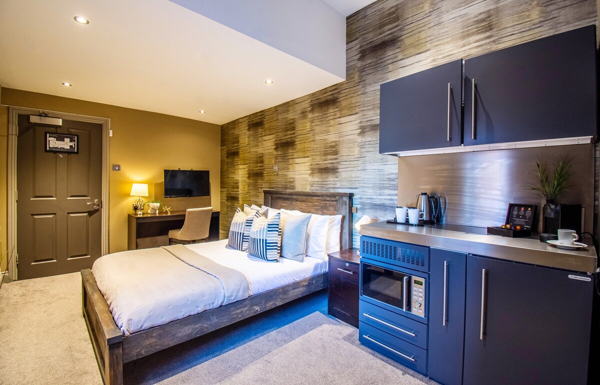 Modern studio in Somerset, suited to both business and leisure stays. Features a comfortable double bed, kitchenette, dedicated workspace with fast WiFi, and a sleek ensuite. Includes free on-site parking, self check-in, and complimentary gym access at nearby Fitness Yeovil. Well located for shops, dining, and transport—ideal for short visits or longer stays with discounted rates. Managed by Stay Gateway, Quality in Tourism accredited.